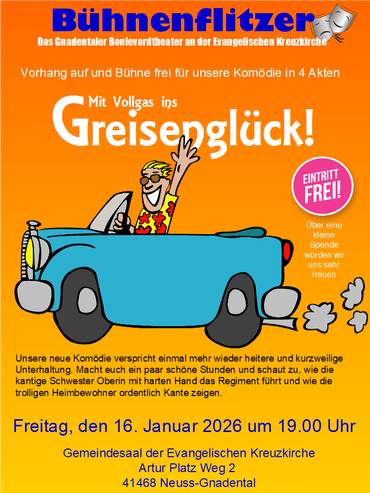 Liebe Theaterfreunde, die Bühnenflitzer, das Gnadentaler Boulevardtheater an der Evangelischen Kreuzkirche, laden herzlich zu ihrer neuen Komödie in vier Akten ein: „Mit Vollgas ins Greisenglück!“