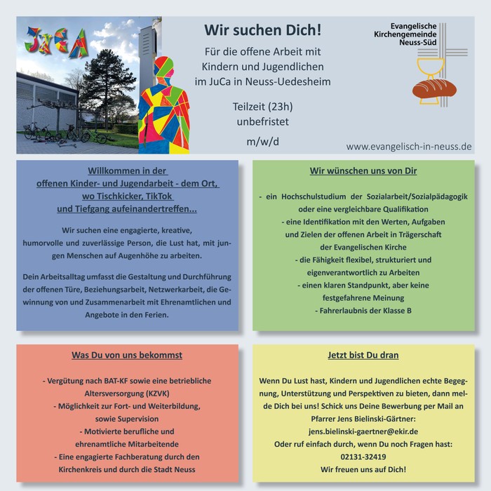 Die evangelische Kirchengemeinde Neuss-Süd sucht für die Offene-Tür-Arbeit an der Friedenskirche in Neuss-Uedesheim eine*n Jugendleiter*in.